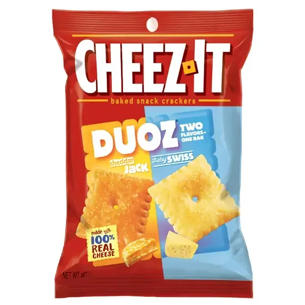 Make snack time more fun with two irresistable Cheez-It flavors mixed together. Each serving of Cheez-It DUOZ Baked Snack Crackers is packed with Cheddar Jack and Baby Swiss flavors made with 100 percent real cheese.