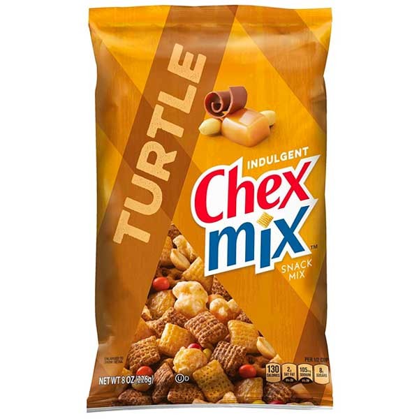 En blanding med karamelovertrukkede korn, korn med kakaosmag, snackkringler, nødder, karamelovertrukkede popkorn og chokoladeagtigt slik. Kun Chex Mix giver dig en lækker og uforudsigelige kombination af former, smage og konsistens i hver håndfuld.