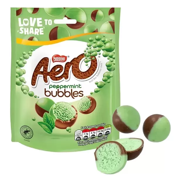 AERO Bubbles Peppermint Mint Chocolate offers a delightful combination of smooth milk chocolate and a light, bubbly peppermint core, perfect for sharing! These small, tasty mint chocolate balls are ideal for cozy moments with friends and family, whether watching a movie or simply enjoying a snack together.