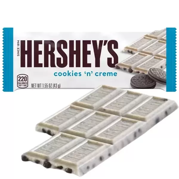 HERSHEY'S Cookies 'n' Creme is a wonderful variation of the classic chocolate bar. It combines a soft, creamy white base with crunchy pieces of chocolate cookies for an irresistible taste experience.
