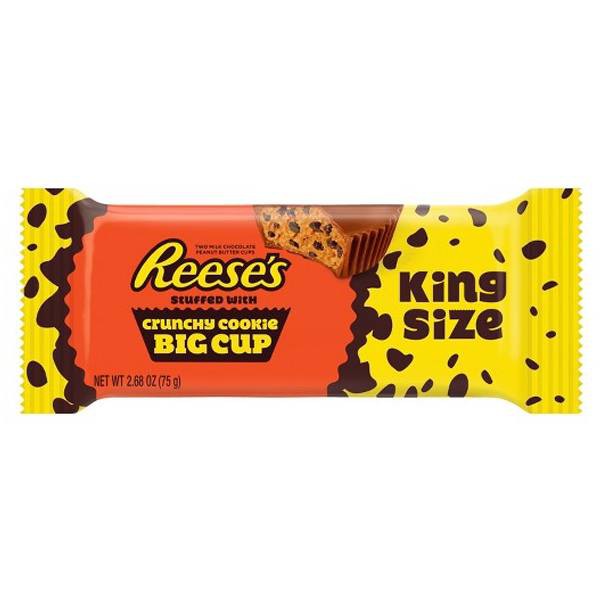 Grib en ven og del en af disse Stuffed with Crunchy Cookie Reeses Peanut Butter Cups sammen. King size Cups, der indeholder et brag af smag og knas. Den familiære mælkechokolade og jordnøddesmørret er fyldt med knasende chokoladekiksesmag og skaber en ny sensation.