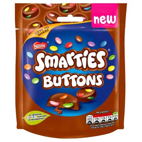 Mælkechokolade-stykker med mini-Smarties i (24 procent). Mælkechokolade med en knasende skal. Del de sjove Smarties Buttons! Afrundede mælkechokoladeknapper, der er fyldt med knasende mini-Smarties. Det er en lækker, sjov og farverig fornøjelse generelt og i en velegnet Smarties Buttons-delepose.