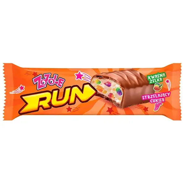 Love when things get wild? The Zozole RUN bar is packed with action! Covered in a creamy layer, it hides sour jelly and popping candy – a totally explosive combo.