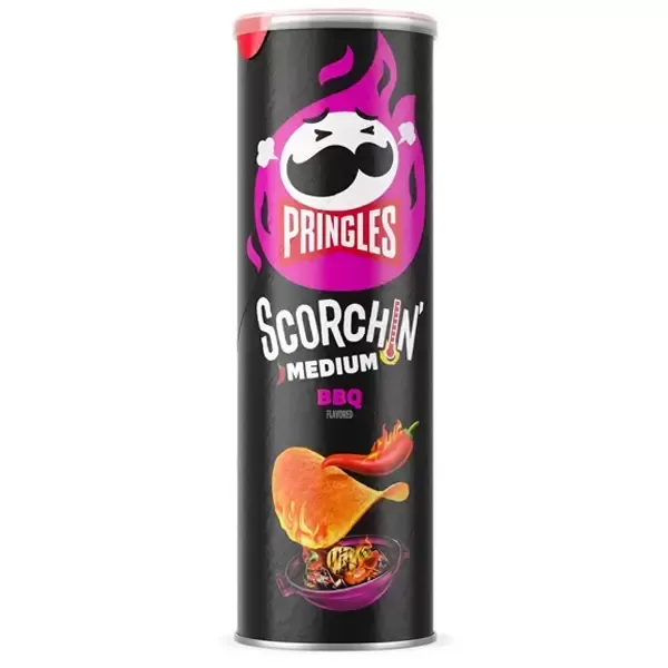 Pringles Scorchin’ BBQ are stackable potato crisps seasoned with an intense smoky BBQ flavor and a fiery, spicy edge. These crisps are irresistibly spicy, always tasty, and never greasy. With an extra kick of spice, these crisps are even hotter than traditional BBQ chips.