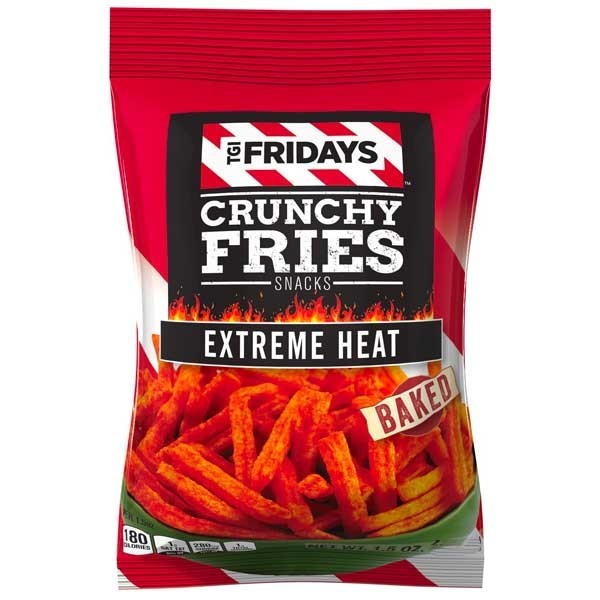 T.G.I. Fridays Extreme Heat Crunchy Fries sætter ild til dine smagsløg med et spark af flammer! Extreme Heat Fries tager skridtet videre end milde men stærke pebre for at give dig en ekstremt krydret smag. Hvis du er vild med stærke snacks, så har TGI Fridays lige givet dig en perfekt pose snacks med knasende chips! Disse bagte, knasende chips er dækket af et ekstremt stærkt krydderi, som vil få dig til at spy ild!