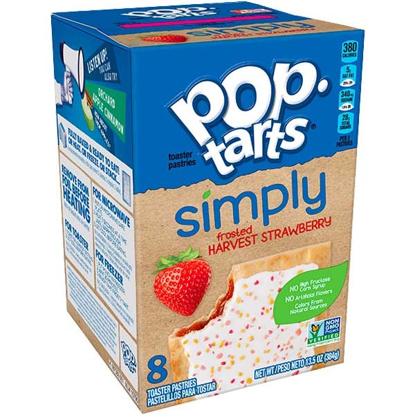 Bløde brødrister-kager med smagen af jordbær og lækker glasur med knasende krymmel på. Pop-Tarts Simply Frosted Harvest Strawberry-kager er søde, gennembagte og lige til at spise! Start din dag med en knasende kage-kant og jordbær-fyld. En lækker morgenfavorit for hele familien. God for hele familien.