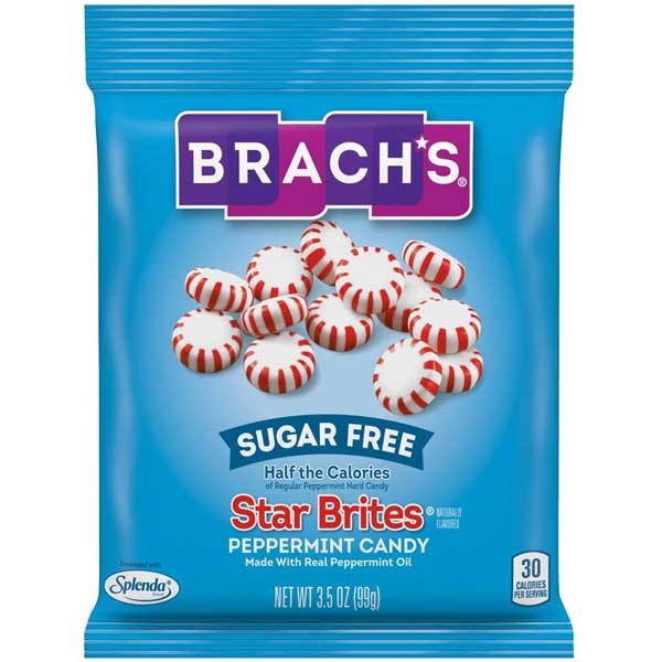 Pebermynteslik med sødemiddel for at give det en frisk smag med de halve kalorier i, der ellers ville være. Brach’s Sugar Free Brites Peppermint-slik er lavet af ægte pebermynteolie.