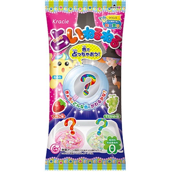 "Uranai" betyder spådomsfortælling, og dette kit er baseret på at, du skal gætte, hvilken farve og smag, du får, når du blander pulverne sammen. Et sjovt slikeksperiment i fire trin, hvor du selv laver slutproduktet! Hvis du er vild med sødt, brusende og farverigt slik, er du simpelthen nødt til at smage dette produkt. Alle trinene er vist på billeder på bagsiden af pakken. Jordbær- & Muskat/Drue-smag med farverige stykker slik!