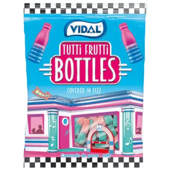 Vidal Tutti Frutti Bottles are a fruity explosion in every bite! These vibrant bottle-shaped gummies are packed with classic tutti frutti flavour and finished with a fizzy sugar coating that adds just the right amount of tang. Soft, chewy and irresistibly fun, they’re the perfect mix of sweet and zesty.
