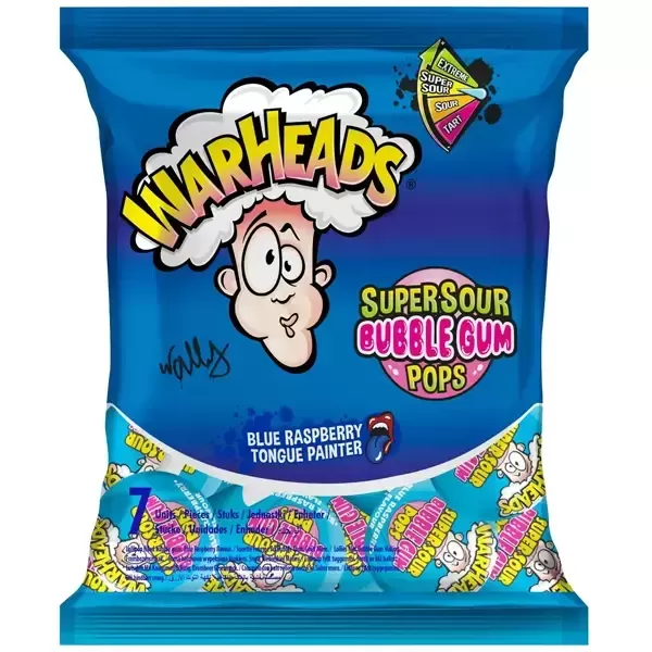 Warheads Super Sour Bubble Gum Pops: Sour blue raspberry lollipop with a sweet gum center. Tongue turns blue! 7 pops per bag.